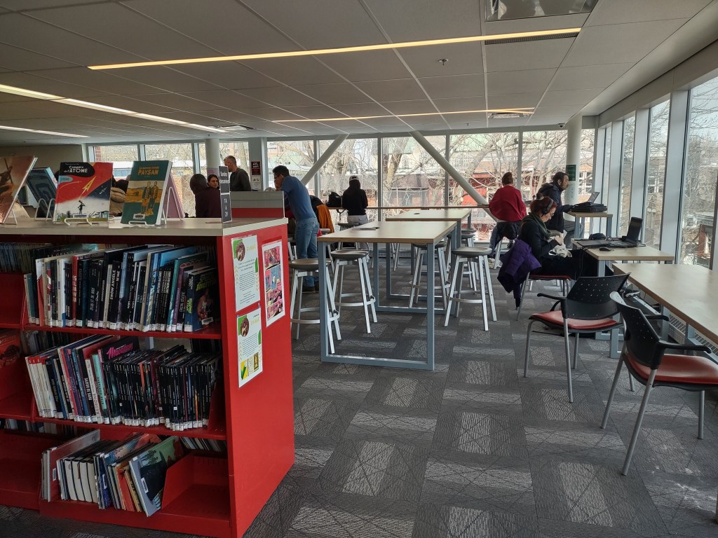 Dans le Village, sur la rue de la Visitation, tout près d’Ontario, la Bibliothèque Père-Ambroise se situe dans un quartier effervescent, mais elle est juste assez en retrait pour demeurer un secret bien gardé. En ce qui me concerne, en tout cas. Je suis passée tout près tellement de fois et j’en ignorais totalement l’existence! Et même une fois à l’intérieur, il faut la chercher un peu puisqu’elle loge discrètement au 3e étage du centre Yvon Deschamps qui accueille l’Association sportive et communautaire du Centre-Sud.