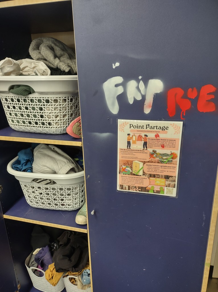 - Le Point Partage, une armoire installée par la Friprue, un point de dons pour encourager la solidarité et réduire le gaspillage. On peut y déposer ou y prendre des vêtements, des accessoires, des jouets ou de petits articles ménagers.