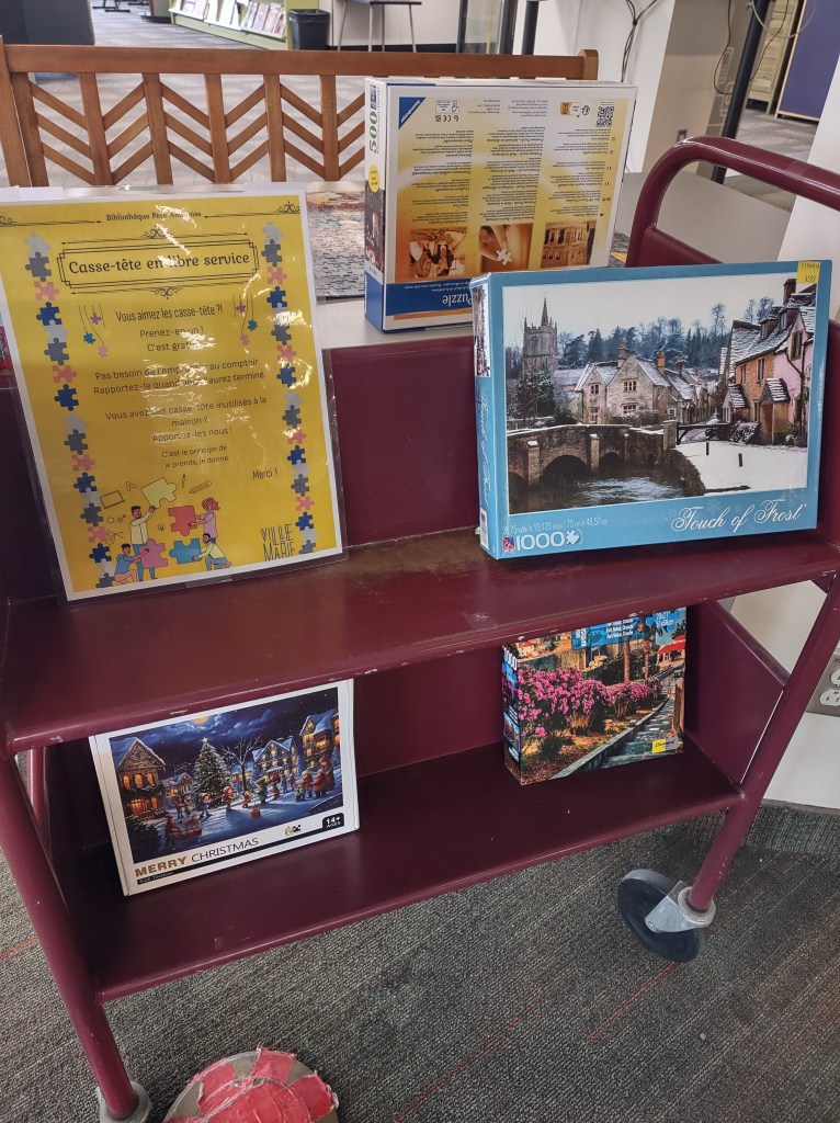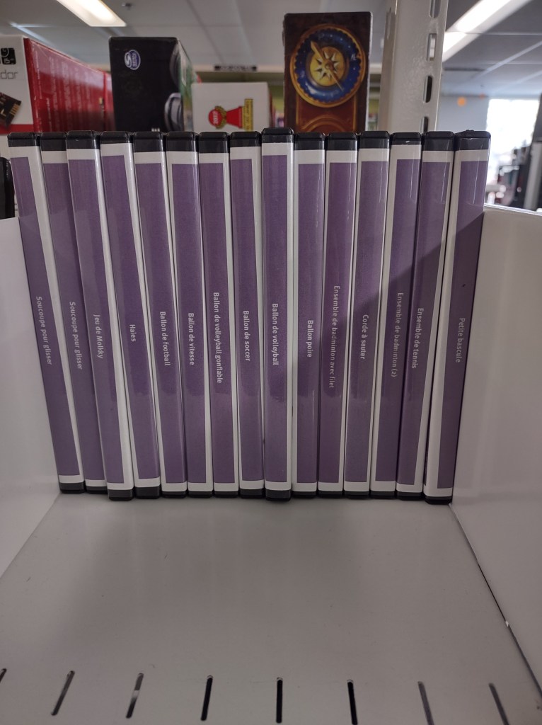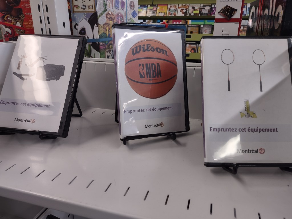 Autres emprunts intéressants à faire : des casse-tête et de l’équipement sportif. J’aime bien d’ailleurs l’idée de réutiliser des boîtes de DVD pour exposer l’équipement disponible.